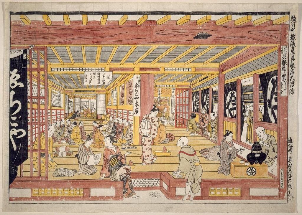 越後屋店頭、江戸の代表的な呉服店で着物の生地を販売した 現金売りを始め、繁盛した。