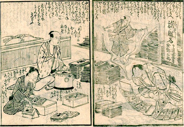 貸本屋を営む商人が貸本問屋を訪れて、町人や農民に貸し出す本を仕入れている図。貸し出された本は歴史物、仏書, 絵本、儒書、軍記、医書、そして小説などです。江戸時代末期には江戸に約、800の貸本屋がありました。