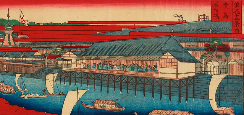 毎年、全国各地で収穫された米は陸路や海路で運ばれ、大阪に集められます。そしてこの市場において世界で初めての先物取引が行われました。多くの大名は財政の安定化を求めて積極的にこの先物取引に参加しました。